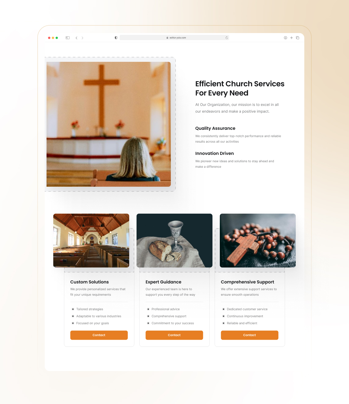 Durch die Nutzung von Yola Sitebuilder ermöglichst du deiner Kirche, eine starke Online-Präsenz mit minimalem Aufwand zu etablieren, sodass du dich auf das konzentrieren kannst, was wirklich zählt – deiner Gemeinschaft zu dienen.