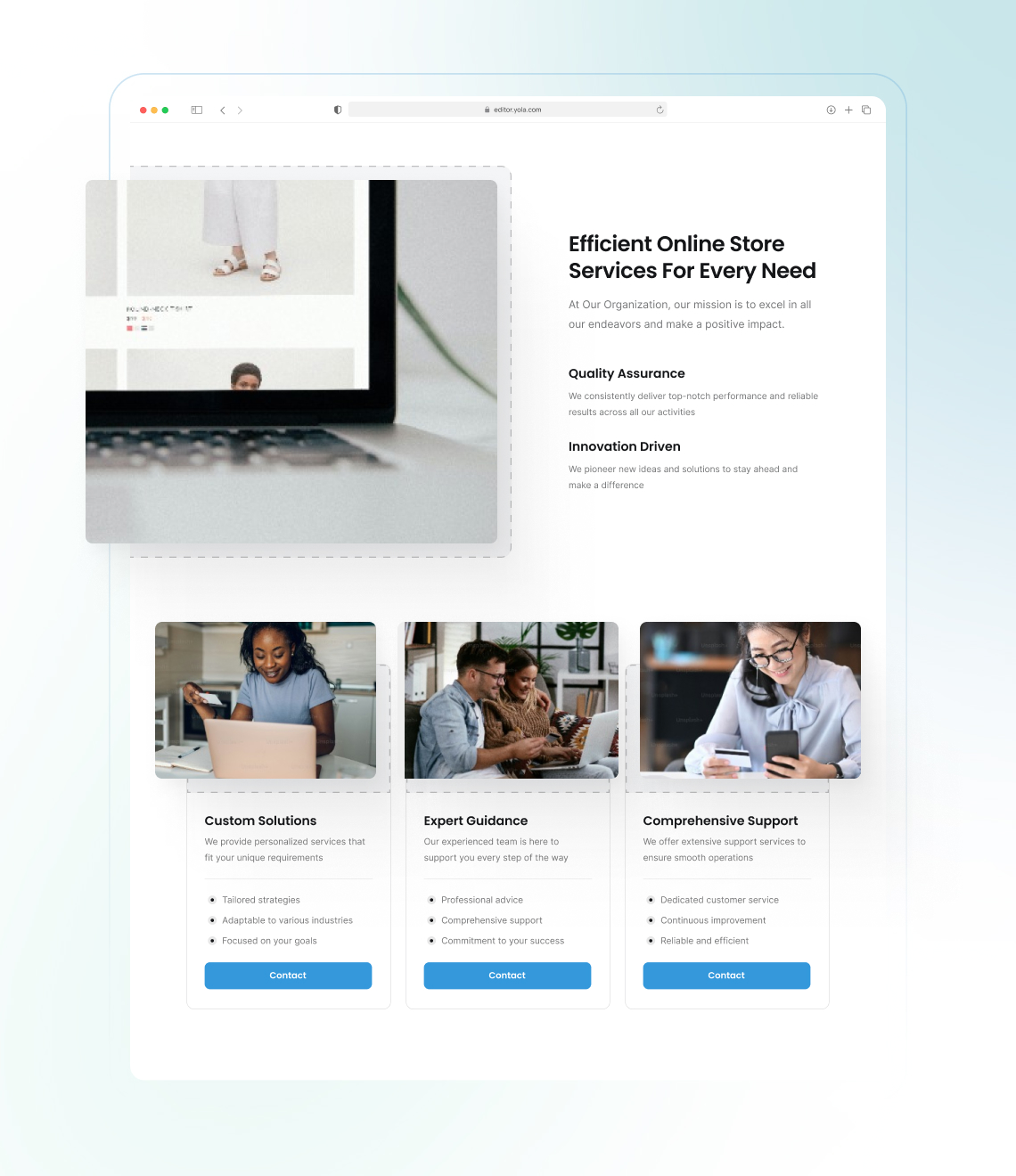 Durch die Nutzung des Yola Sitebuilders ermöglichst du dir selbst, eine starke Online-Präsenz mit minimalem Aufwand aufzubauen, sodass du dich auf das konzentrieren kannst, was du am besten kannst – deine Kunden bedienen.