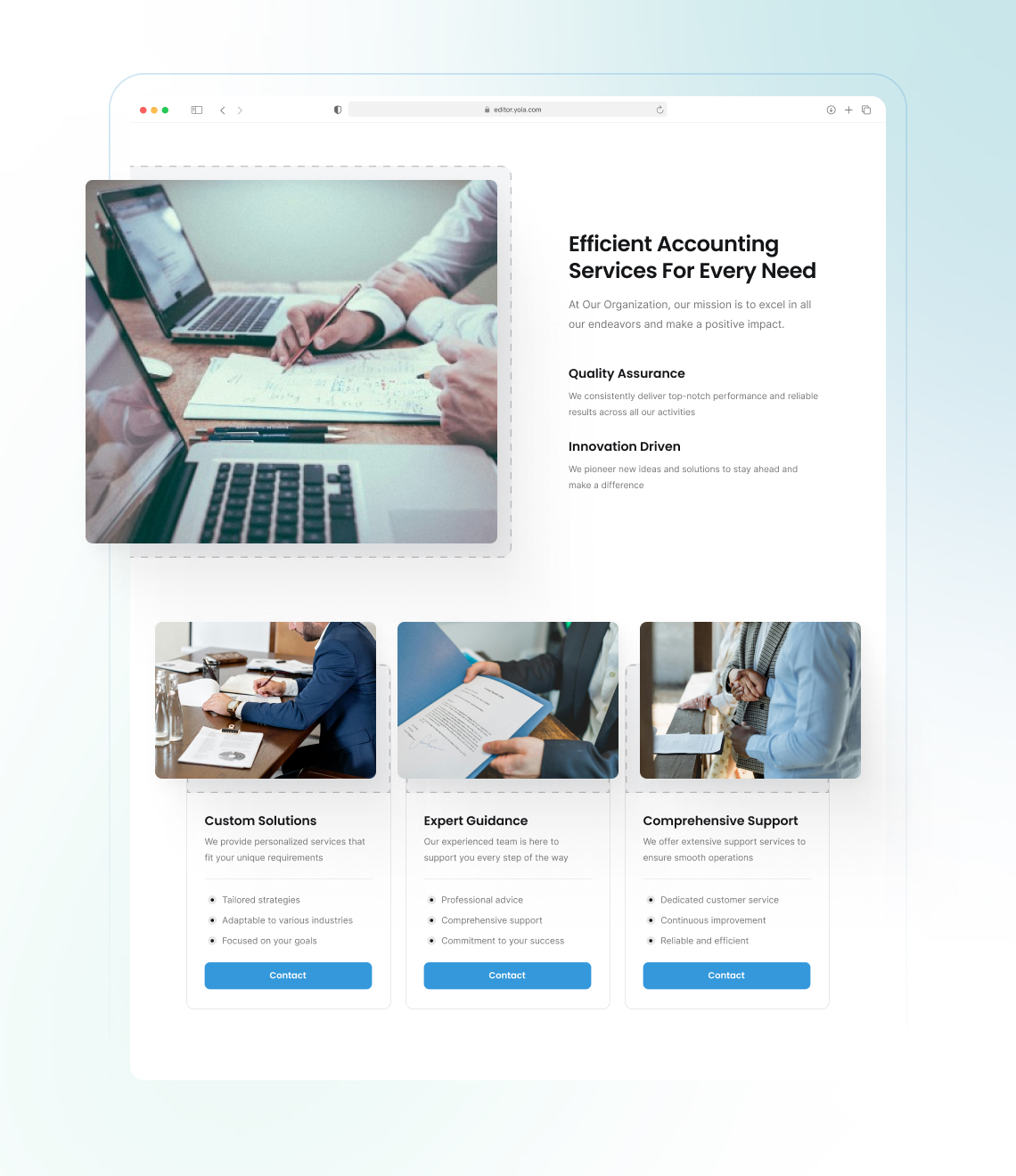 Yola ist eine der besten Lösungen für Buchhaltungsdienste aufgrund seiner Benutzerfreundlichkeit, Flexibilität und robusten Funktionen wie vorgefertigte Vorlagen, einem responsiven Sitebuilder, Domainverwaltung, Online-Shop und vielem mehr.