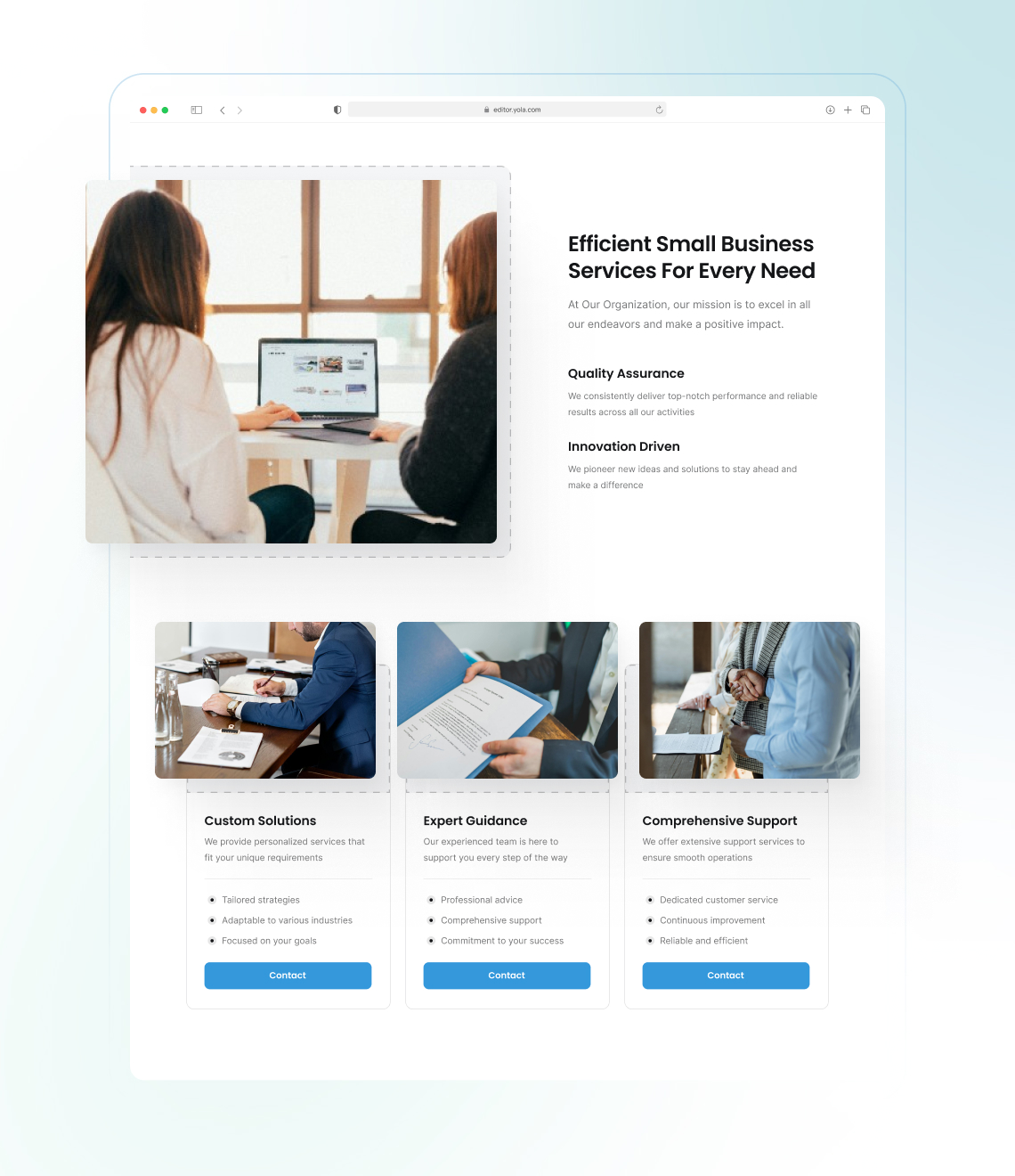 Etabliere eine solide Online-Präsenz für dein kleines Unternehmen, ganz ohne Programmierkenntnisse. Beginne damit, Kunden anzuziehen, deine Dienstleistungen zu präsentieren und deine Marke mit Yola zu erweitern.