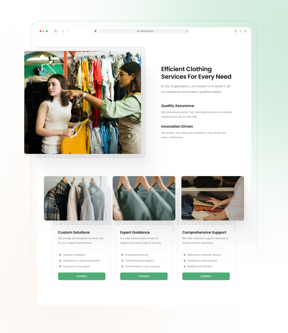Gestalte deine Bekleidungs-Website in nur wenigen Stunden mit Yolas einfacher Benutzeroberfläche und anpassbaren Vorlagen.