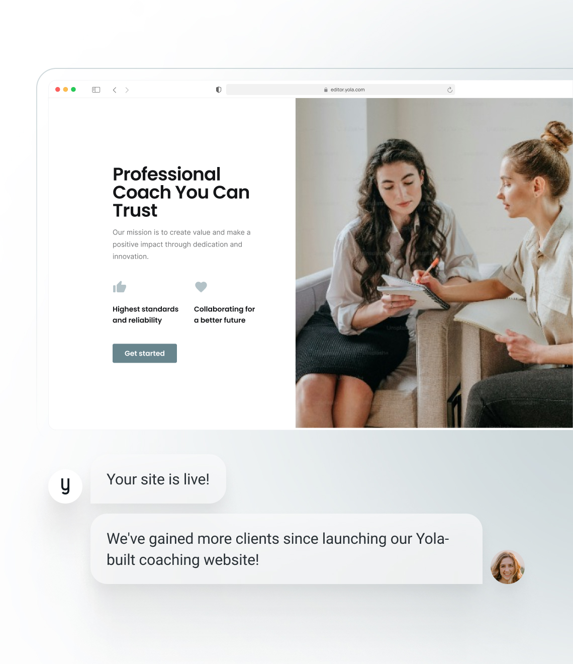 Diseñar una página web para coaches con Yola suele llevar solo unas pocas horas, gracias a nuestra interfaz fácil de usar y a las plantillas personalizables para sitios web de coaching.