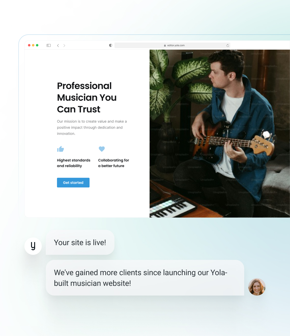 Diseñar una página web para músicos con Yola suele llevar solo unas pocas horas, gracias a nuestra interfaz fácil de usar y a las plantillas personalizables para sitios web de músicos.
