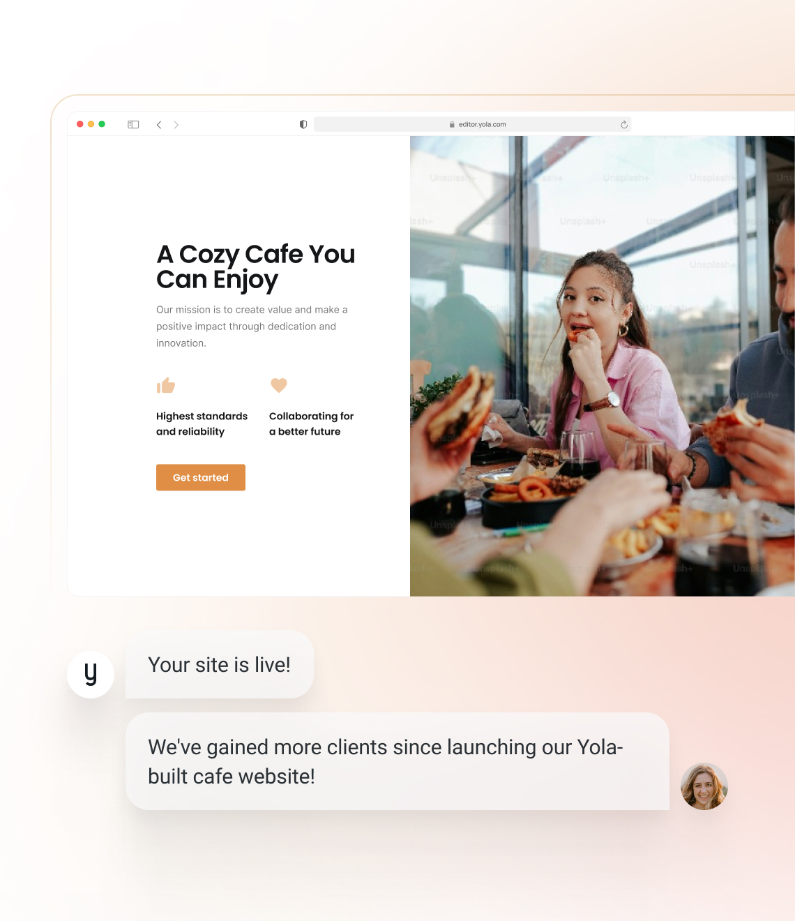Yola hace que crear un sitio web para tu negocio, incluyendo un sitio para tu cafetería, sea rápido y fácil, a menudo tomando solo unas pocas horas para completarlo.