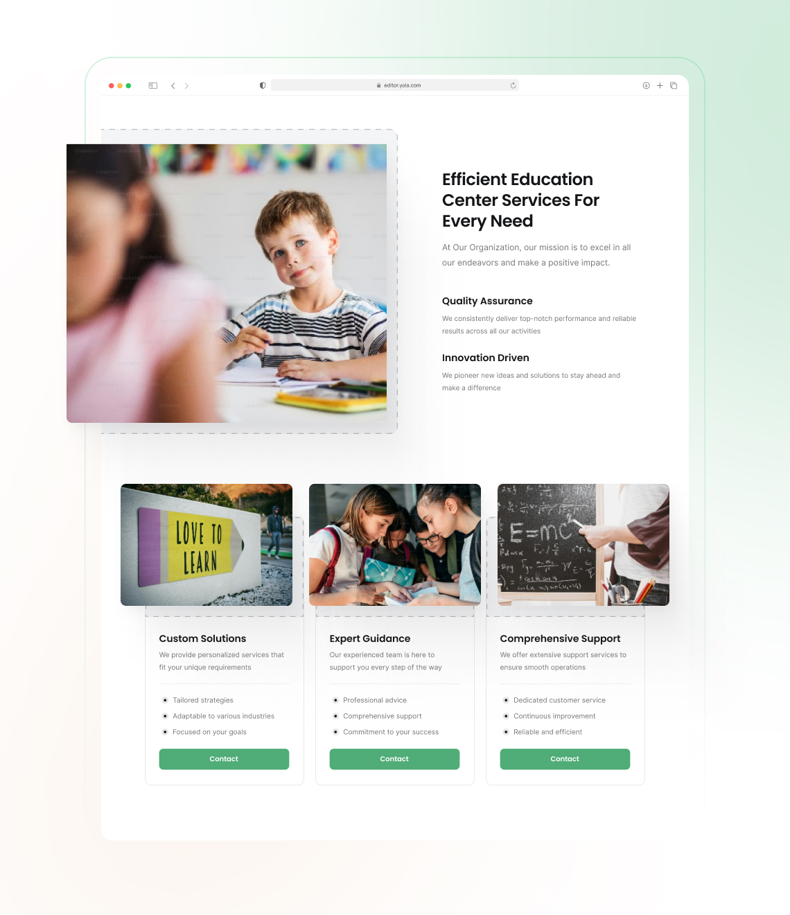 Echa un vistazo a estas impresionantes plantillas adaptadas a dispositivos móviles, diseñadas específicamente para centros educativos. Están pensadas para servicios de tutoría, cursos de preparación para exámenes, programas de aprendizaje de idiomas, centros de educación científica, centros de educación en salud y más. Con el creador de sitios web de Yola, crear una presencia profesional en línea es fácil. Perfecto para educadores, formadores e instituciones de aprendizaje por igual.
