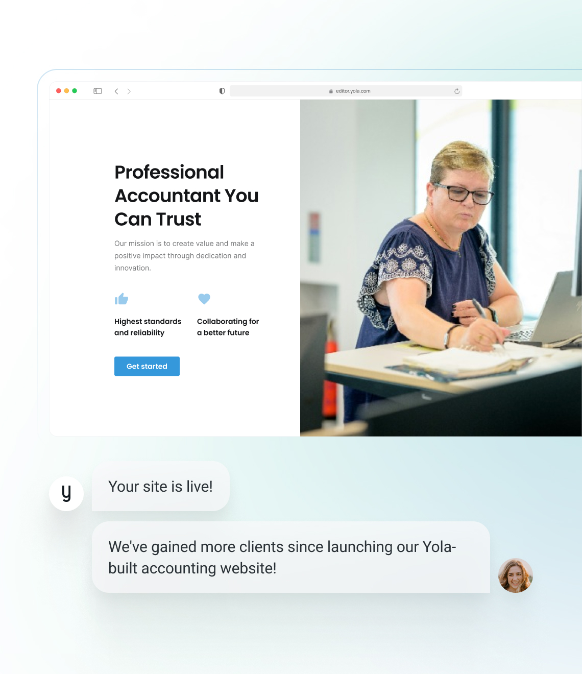 Yola est l'une des meilleures solutions pour les services comptables grâce à sa facilité d'utilisation, sa flexibilité et ses fonctionnalités robustes, telles que des modèles prédéfinis, un créateur de sites responsive, la gestion de domaine, une boutique en ligne, et bien plus encore.