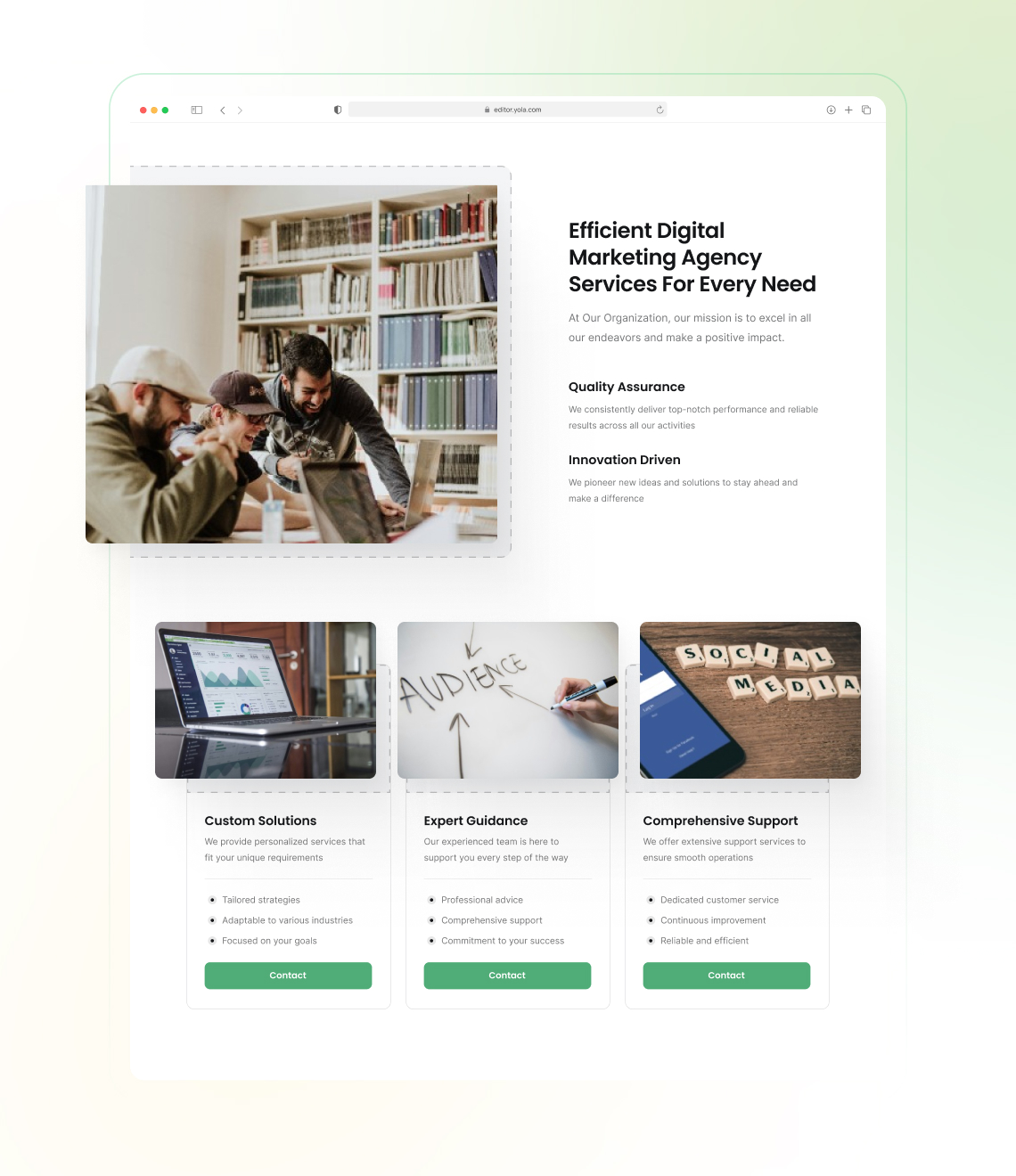 Un site web d'agence de marketing digital devrait comporter une page d'accueil, une page à propos de nous, des pages de services, de témoignages et de contact pour fournir des informations complètes aux visiteurs. Vous pouvez facilement ajouter ces pages à votre site web basé sur Yola.