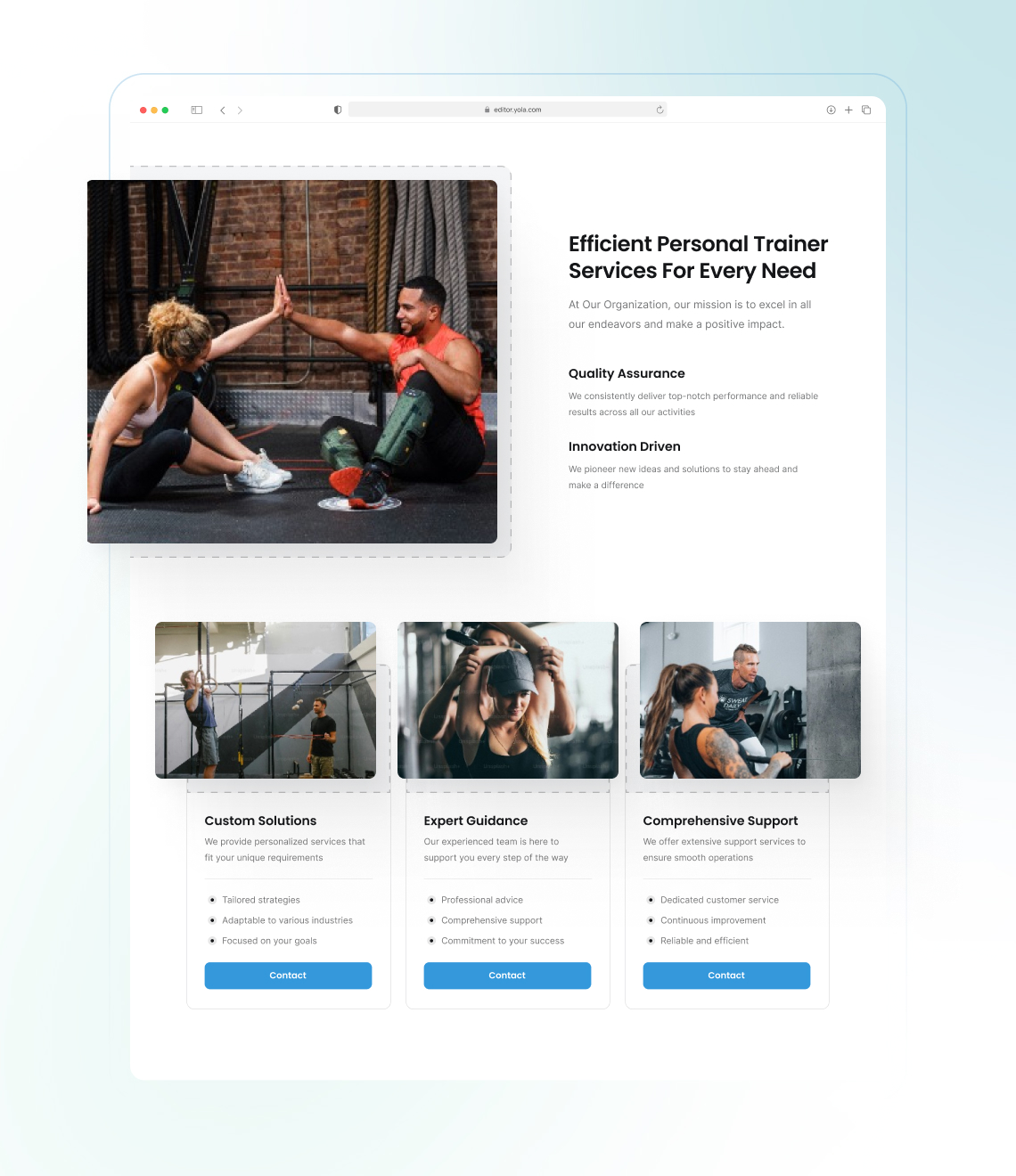 Découvrez ces superbes modèles adaptés aux mobiles, conçus spécialement pour les coachs sportifs, les entraîneurs personnels et les programmes de boot camp. Ces options sont idéales pour tous ceux qui travaillent dans le secteur du fitness. Avec le créateur de sites Yola, vous pouvez facilement créer une présence en ligne professionnelle qui met en valeur vos services.