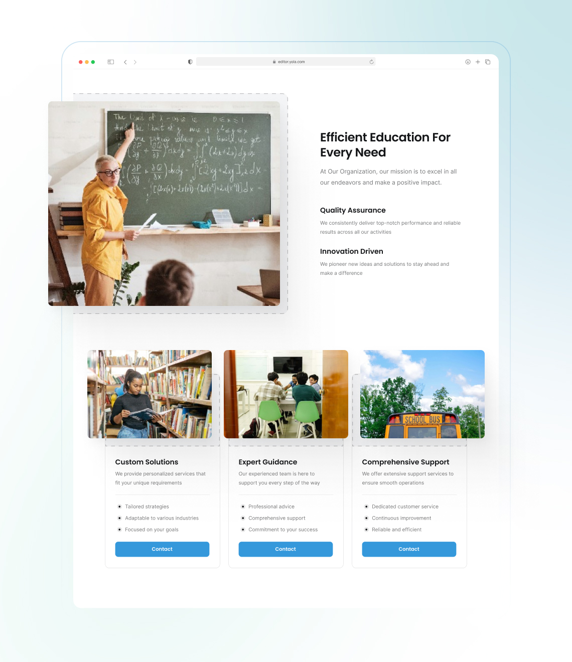 L'interface et les modèles de Yola vous permettent de concevoir un site web professionnel ou un site web scolaire en seulement quelques heures.