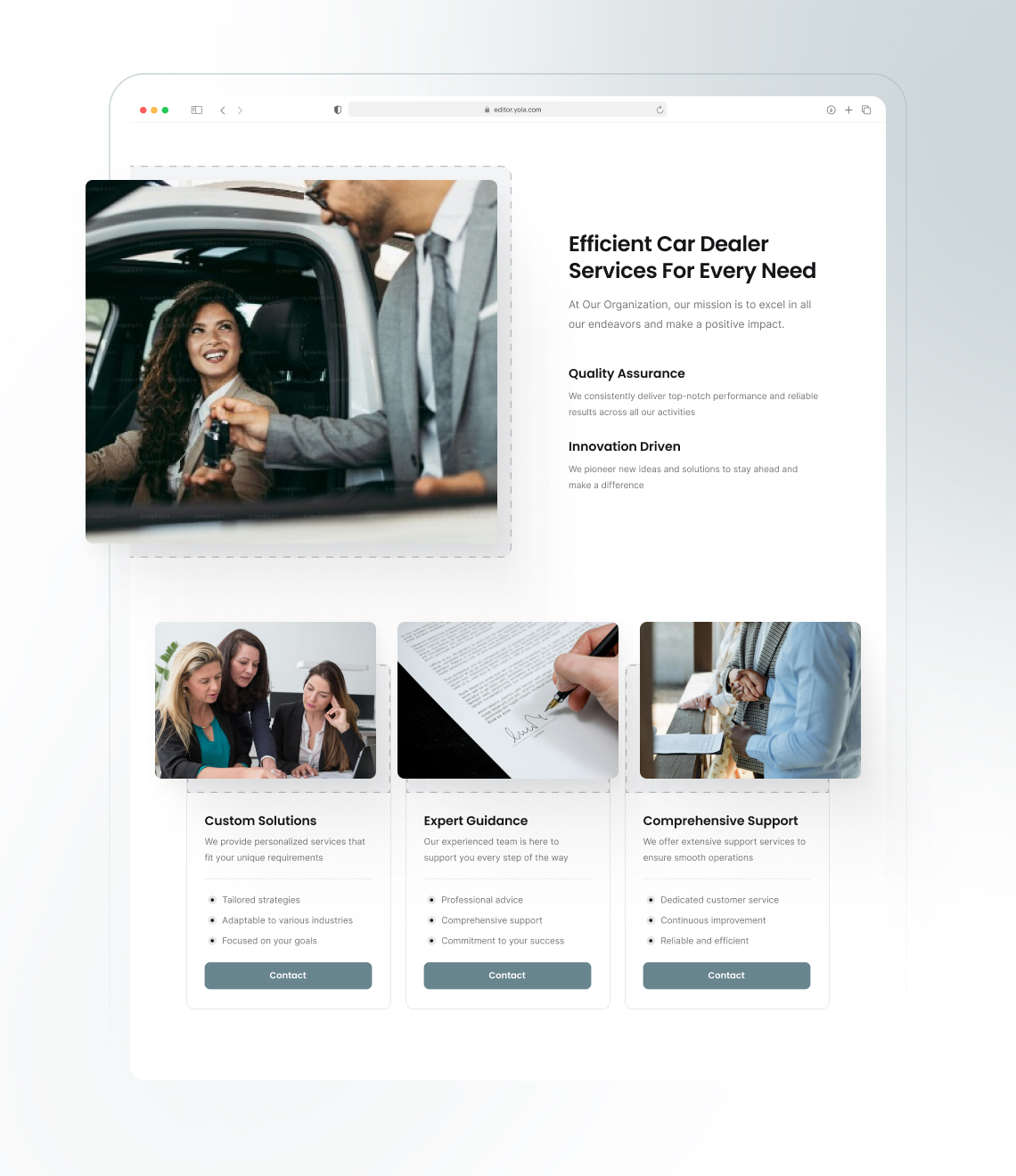 Quando costruisci un sito web, selezionare la piattaforma giusta è essenziale, specialmente per i concessionari di auto. Yola Sitebuilder è una scelta eccellente per i concessionari che vogliono una presenza online professionale senza competenze di programmazione. La sua interfaccia intuitiva ti permette di trascinare e rilasciare elementi, rendendo il processo di creazione del sito semplice e piacevole. Puoi facilmente personalizzare il tuo sito per riflettere il tuo marchio, mostrare il tuo inventario e fornire informazioni essenziali – tutto in poche ore.