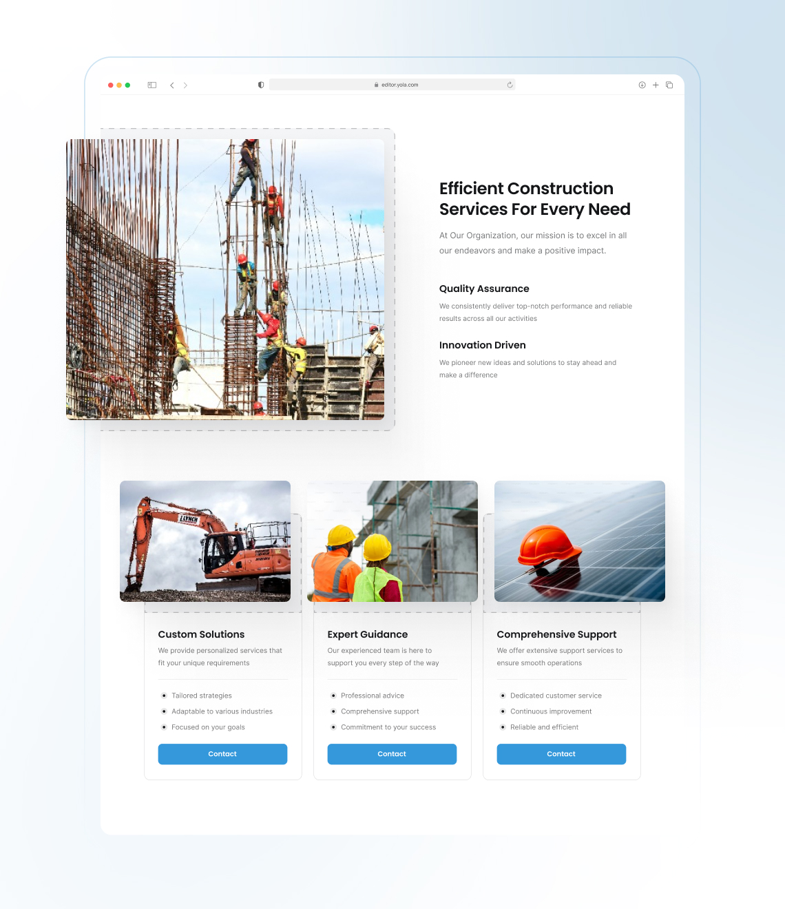 Utilizzando Yola Sitebuilder, ti dai il potere di stabilire una forte presenza online con il minimo sforzo, permettendoti di concentrarti su ciò che fai meglio—servire i tuoi clienti nel settore delle costruzioni.