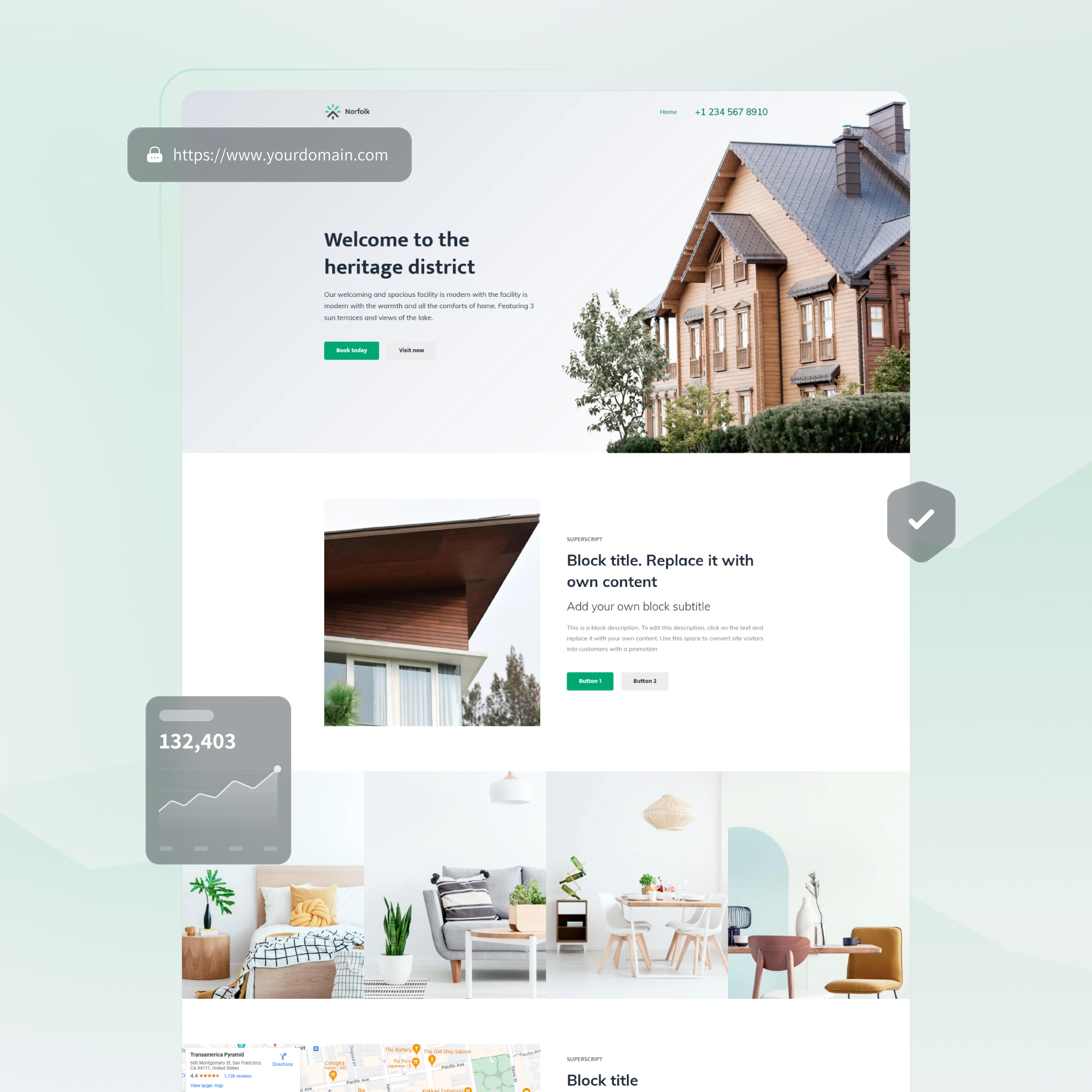 Display your property listings, virtual tours, and pricing details. Use gallery slideshows, service blocks, and pricing forms to create an ideal real estate listing portfolio.