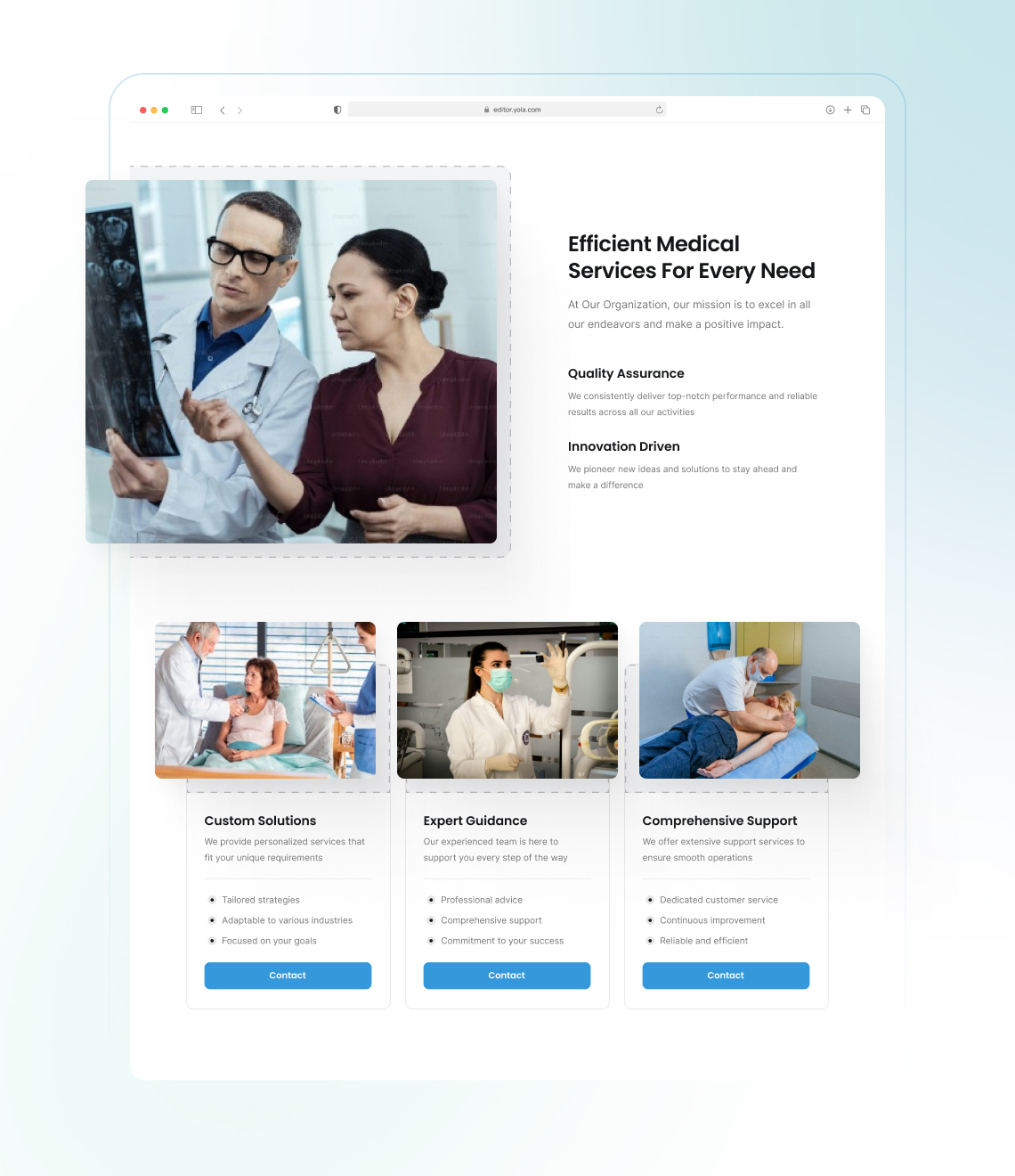 Ao construir um site, selecionar a plataforma certa é essencial—especialmente para aqueles na área médica. Nossa plataforma, Yola Sitebuilder, é uma excelente escolha para profissionais de saúde que desejam estabelecer uma presença online profissional sem precisar de habilidades de programação. Sua interface intuitiva de arrastar e soltar torna a criação de um site simples e agradável. Você pode personalizar facilmente seu site para refletir sua marca, mostrar seus serviços e fornecer informações vitais—tudo em poucas horas.