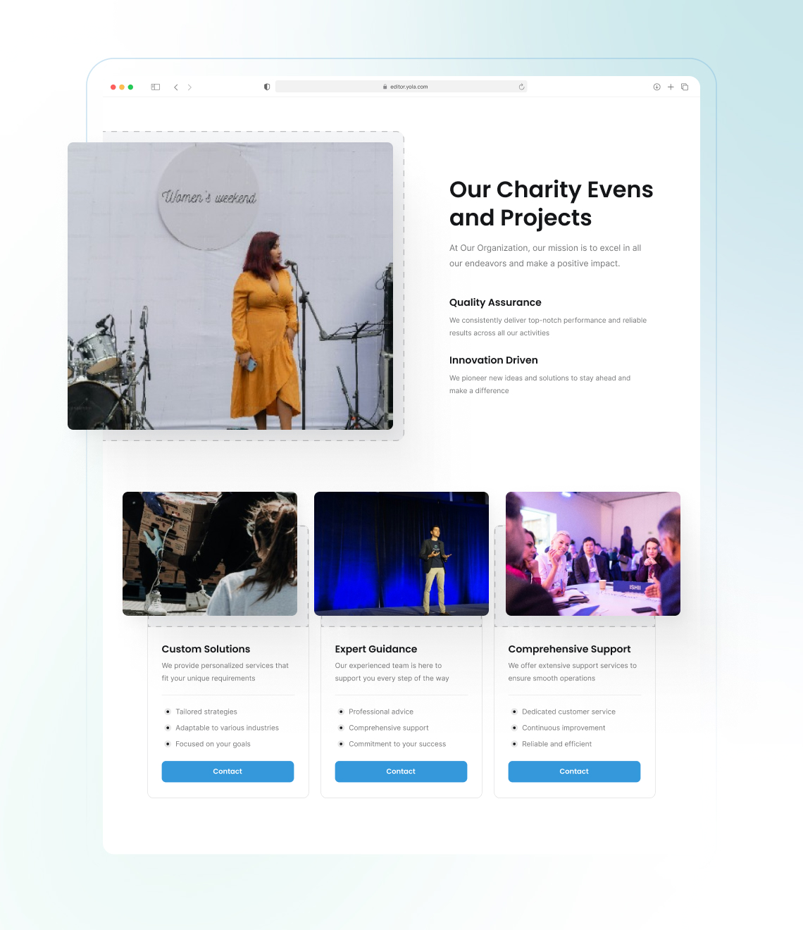 Ao usar o Yola Sitebuilder, você capacita sua ONG a estabelecer uma forte presença online com o mínimo de complicações, permitindo que você se concentre no que mais importa—servir sua comunidade.