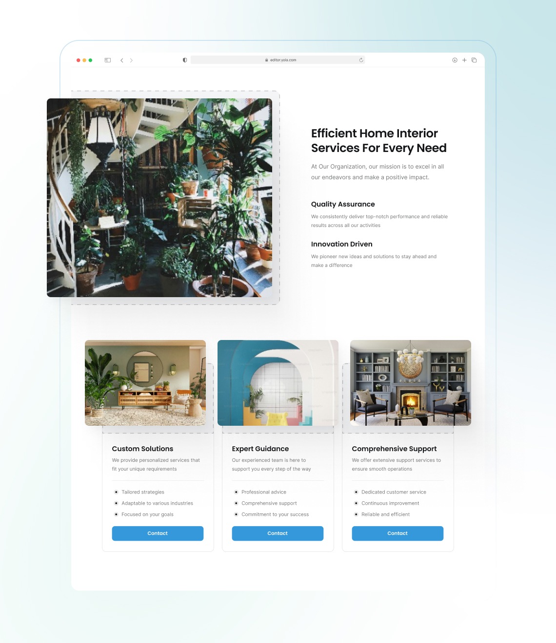 Yola é um dos melhores construtores de sites para serviços de interiores residenciais devido à sua facilidade de uso, flexibilidade e recursos robustos, como modelos pré-desenhados, construtor de sites responsivo, gerenciamento de domínios, loja online e muito mais.