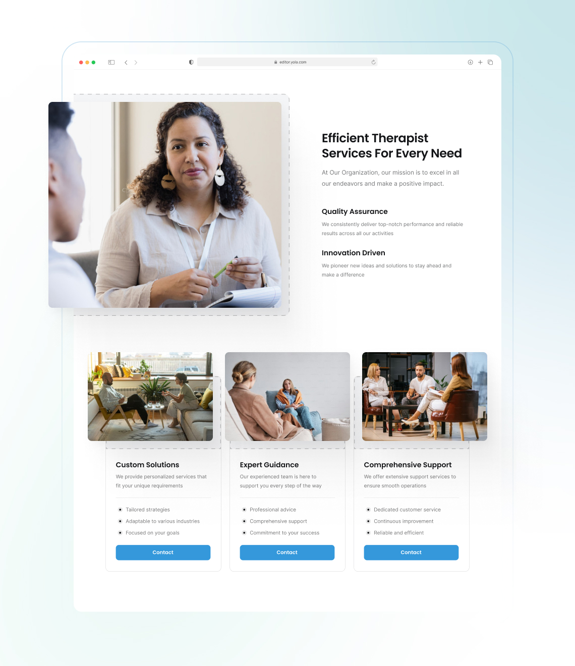 Estabeleça uma presença online sólida para seus serviços de terapia, sem necessidade de programação. Comece a oferecer serviços e atrair novos clientes online com a Yola.