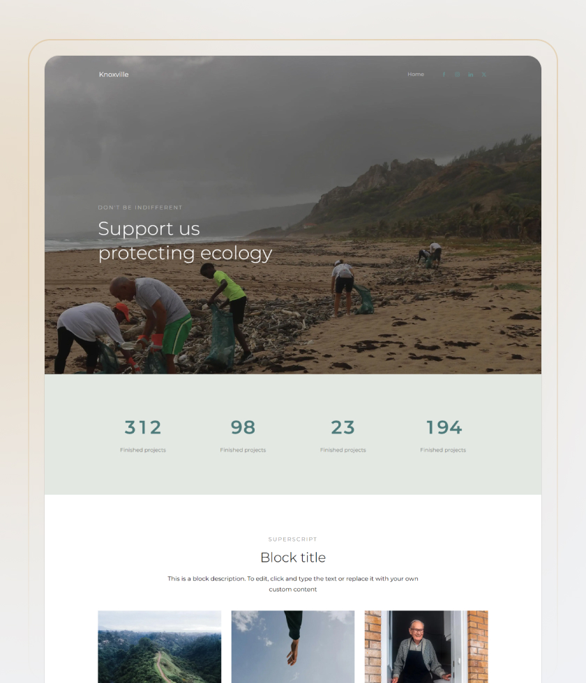 Os modelos de site de doação da Yola ajudam você a ficar online rapidamente. Escolha um design que seja compatível com dispositivos móveis e fácil de personalizar para suas necessidades. Escolha um modelo para começar!