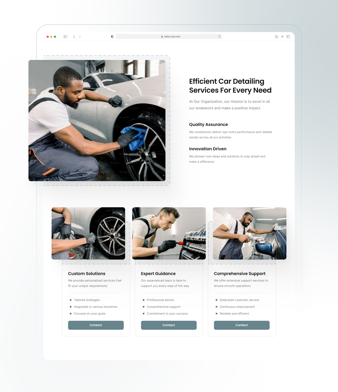 Yola é um dos melhores construtores de sites para um negócio de detalhamento de carros. Ele oferece recursos fáceis de usar e modelos personalizáveis que podem ajudar a mostrar seus serviços de forma eficaz, facilitando a atração e o engajamento de clientes.