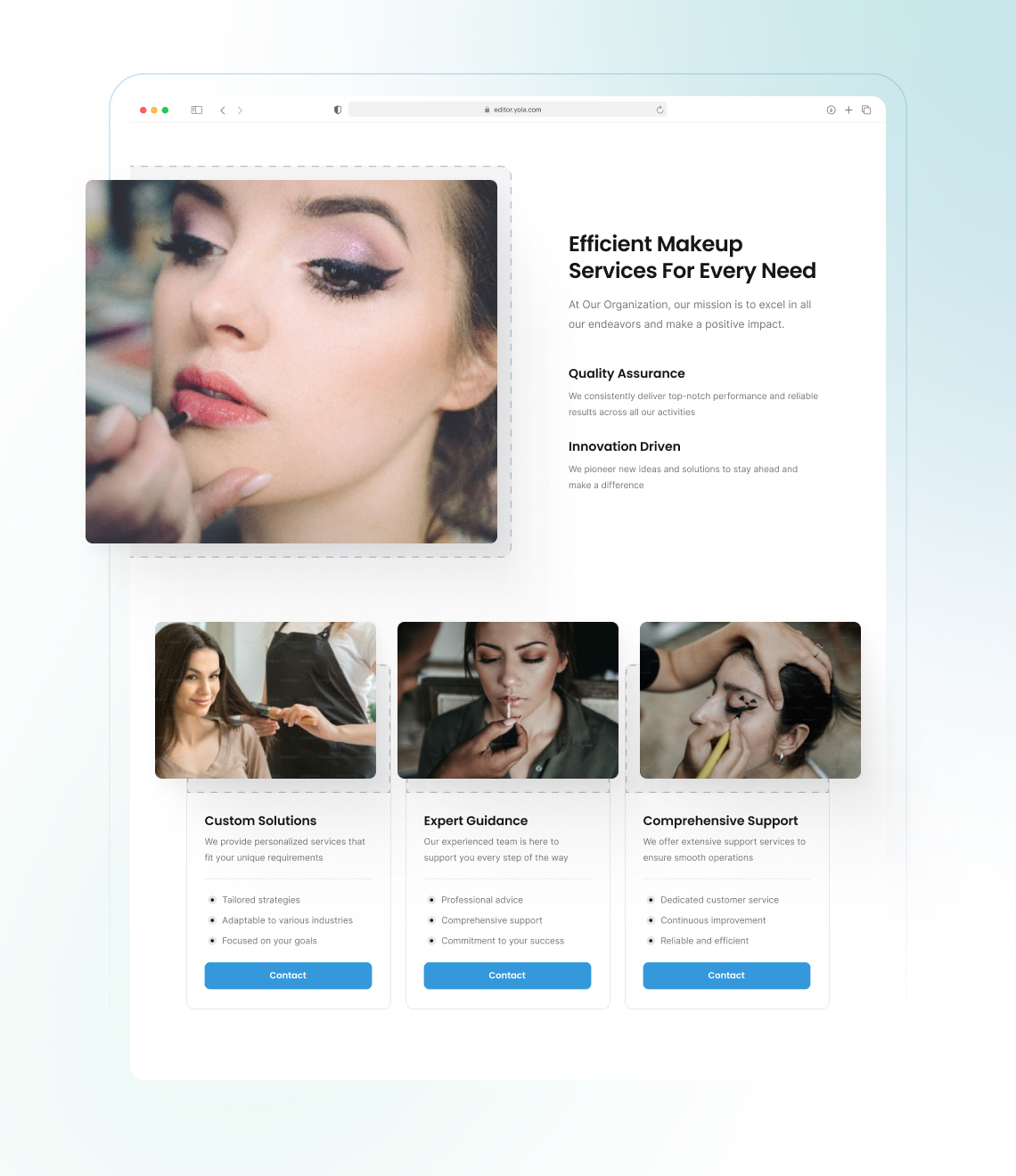 A plataforma intuitiva da Yola permite que você projete um site comercial, incluindo um site de maquiagem, em apenas algumas horas, usando modelos personalizáveis.