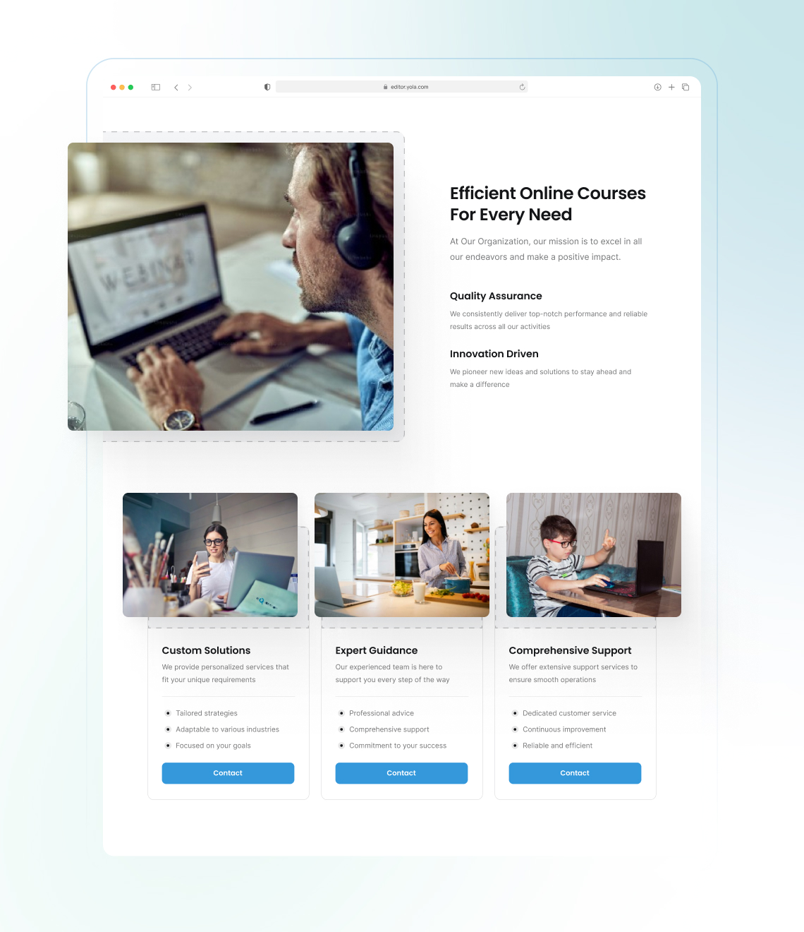 Desenhe o site do seu negócio ou um site de curso online em apenas algumas horas com a interface simples e os modelos personalizáveis da Yola.