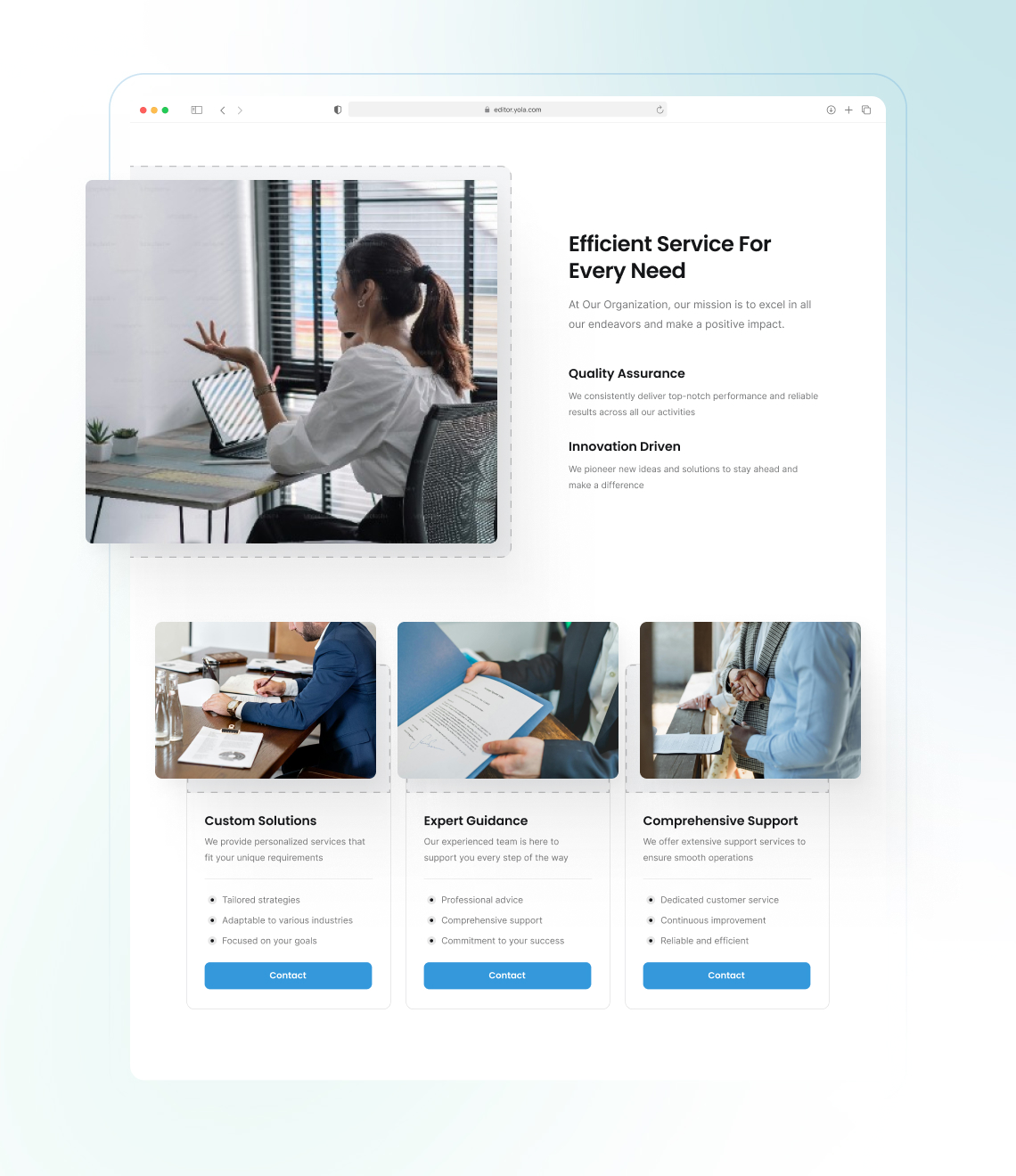 Com a interface fácil de usar da Yola, criar um site de serviços e um site de negócios pode ser feito em apenas algumas horas.